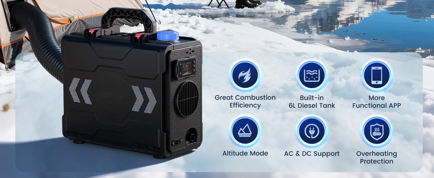 - 【Quiet Operation with Silent Fuel Pump】 The air duct outlet remains the primary noise source (65 dB, equivalent to normal conversation), but our upgraded silent fuel pump eliminates the irritating ticking sounds found in traditional heaters. Perfect for uninterrupted sleep in vans, cabins, or tents. Enjoy reliable warmth all night, without the disturbance of a humming heater.