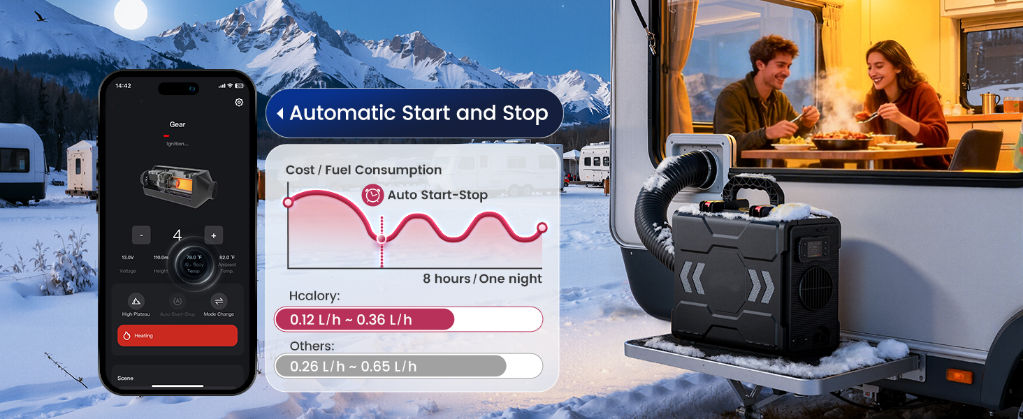 - 【High Efficiency & Rapid Heating】 Achieves 36% higher fuel efficiency through a redesigned combustion chamber and intelligent algorithm optimization. With an ultra-low fuel consumption of only 0.032-0.095 Gal/h (0.12-0.36 L/h), it can run for up to 50 hours at minimum setting on a single tank. Enjoy powerful, long-lasting warmth while significantly reducing your fuel costs and refills.