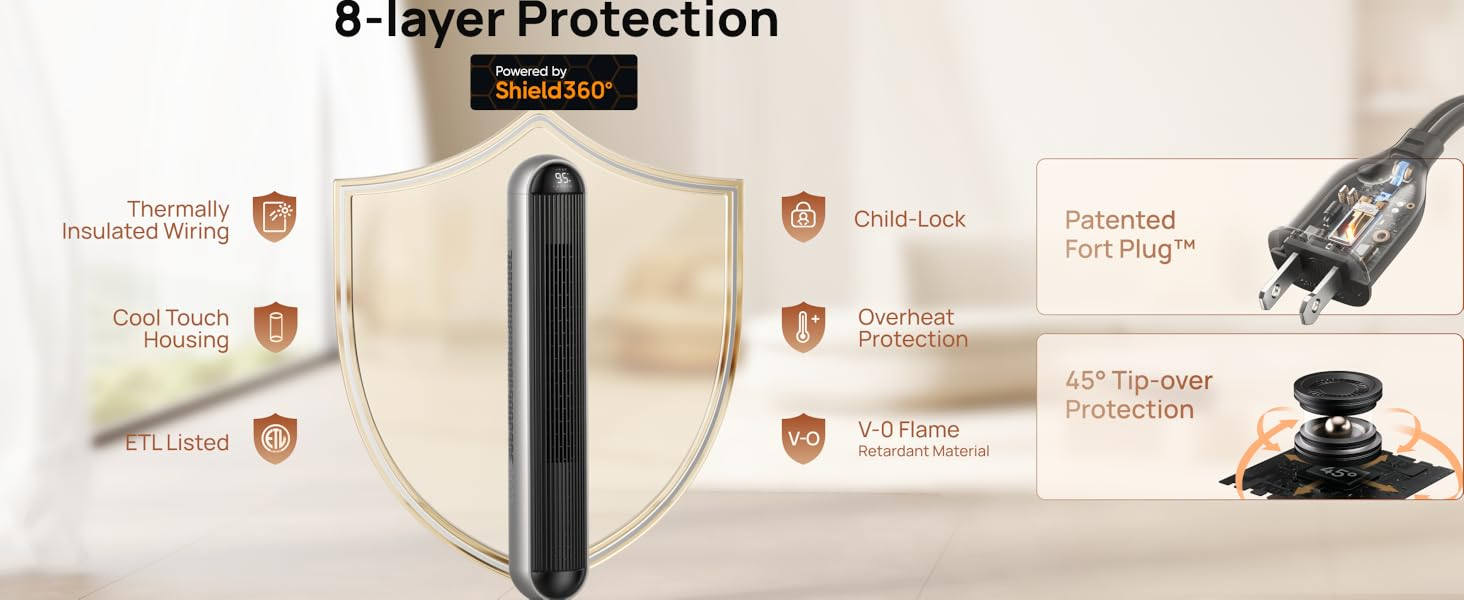 - 8-layer Protection: This heater for indoor use packs 8 safety features for ultimate peace of mind, including our patented FortPlug, V-0 flame retardant built, overheat and tip-over protection, thermal insulated wiring, cool touch housing and child lock, all certified by ETL