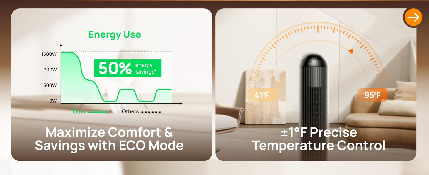 - Go Large on Heating Power and Savings: Powered by Hyperamics larger PTC element, this heater for indoor use delivers instant 2s heat and lets you set up room temperature anywhere from 41-95˚F with ±1.5˚F precision thanks to advanced ECO mode
