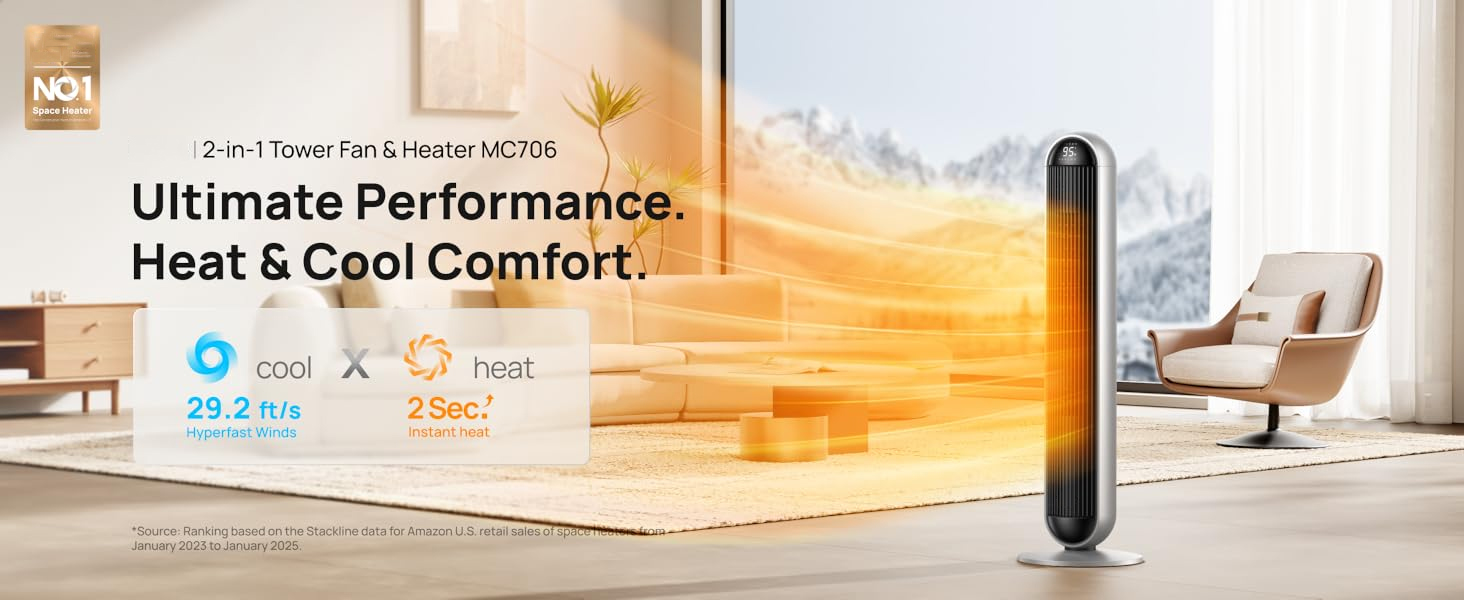 - The Ultimate Fan & Heater: the MC706 integrates an auto-shift tech that lets you go from a 5-level 1500W PTC room heater in winter to 12 cooling fan speeds in summer, making this 42 inch 2-in-1 heater fan for bedroom a great option for all-season use